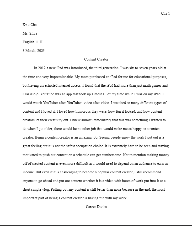 Choice of Career is a research essay I made earlier in the school year, the topic was a career of our choice so I chose to write about an occupation that I found interesting. The purpose of this essay was to do research on the career and determine if it was a job a person should pursue. I wrote this essay not only with just the research I did for it but also with personal feelings since the occupation is something I have a personal connection to. This essay shows off my more recent writing skills and how I’m able to write up text content.